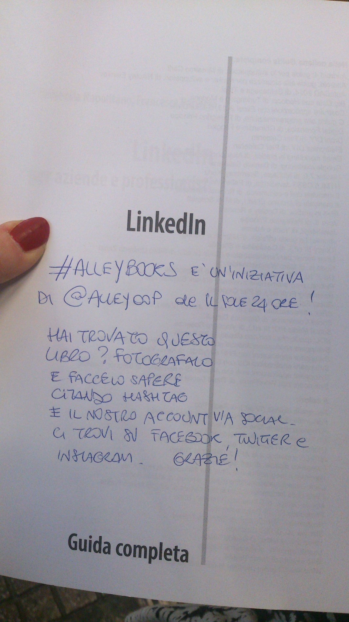 I libri hanno iniziato a viaggiare. A Milano, Roma, Venezia, Modena. Su un treno, in metropolitana, sulla panchina di un parco o al tavolino di un caffé. Da ieri Gramellini, Severgnini, Litizzetto, De Botton, Seneca, Flaubert, Lucrezio, Duras, Faletti aspettano un nuovo lettore in giro per le città italiane. Qualcuno è già stato trovato e una volta letto sarà rimesso in viaggio. Altri volumi sono scomparsi e magari riappariranno fra qualche giorno su un account Twitter, Facebook o Instagram grazie all’hashtag #AlleyBooks. E il bookcrossing diventa così un gioco, una caccia al tesoro al libro che ci interessa, un contagio a leggere. Andrea Pezzi e Cristiana Capotondi hanno lasciato “La vera storia del pirata Long John Silver” su un Frecciarossa Milano-Napoli questa mattina. Alessandra Fava ha portato con la figlia “Il maestro e Margherita” ad X Factor ieri sera. Ferdinando De Bellis ha lasciato un volume su un ponte di Venezia. Doni che si lasciano a sconosciuti. Doni di pagine, parole, pensieri ed emozioni. Un ponte lanciato verso gli altri. E a volte gli altri ci vengono a cercare per ringraziarti: come è successo a Claudia Radente che sulla sua pagina Facebook ha trovato questo messaggio “Roberto Iosif Vissarionovič Arzuffi Si è fatto un viaggio partendo dalla Centrale, è passato nel metal detector del Tribunale di Bergamo e trascorrerà il fine settimana in Monferrato. Poi, questo libro girovago, come per incanto, cambierà lettore… Anche se la stagione lo renderà difficile, cercherò di contare i fiori del mio giardino invece delle foglie cadenti….“.