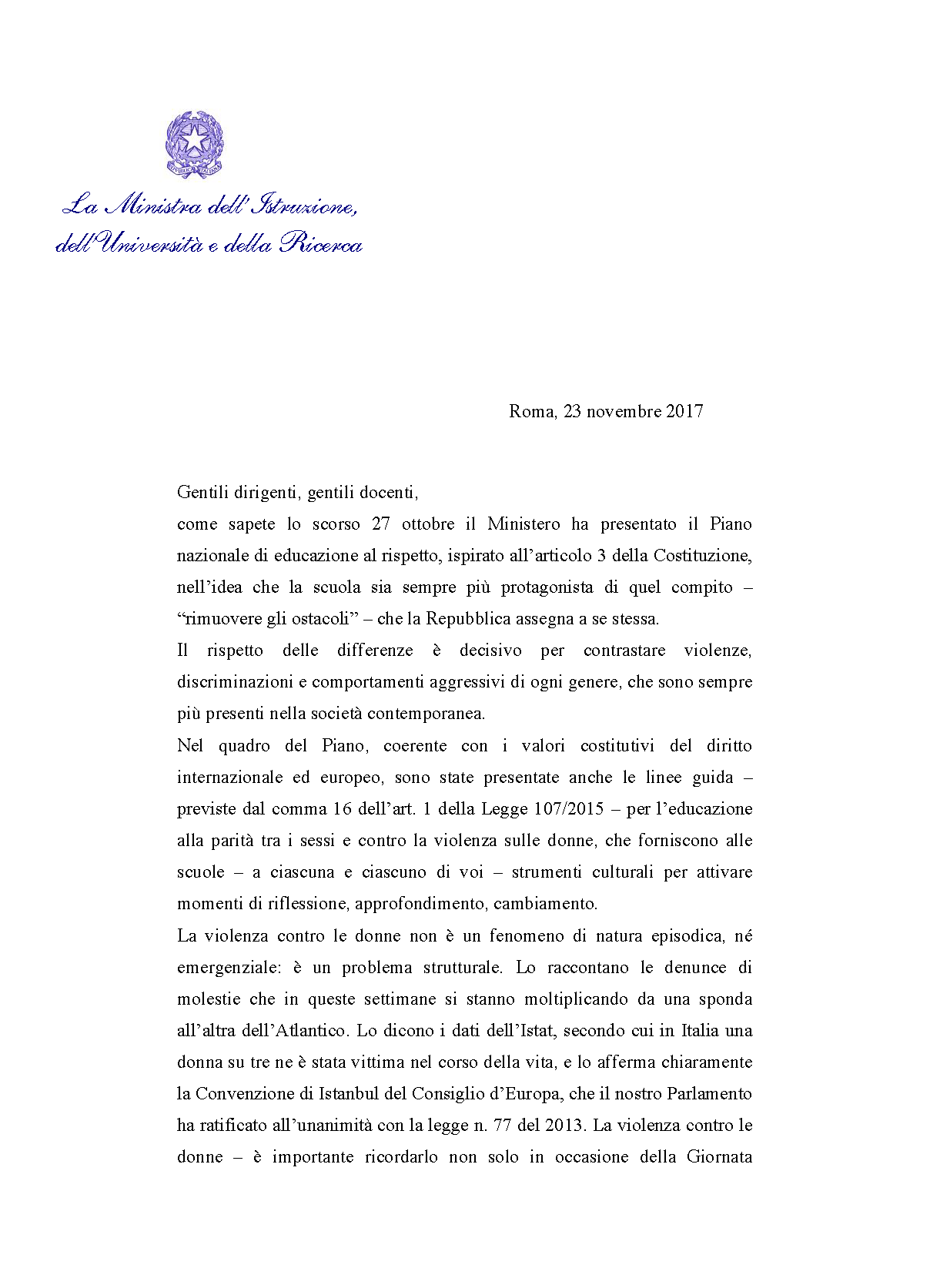 come sapete lo scorso 27 ottobre il Ministero ha presentato il Piano nazionale di educazione al rispetto, ispirato all’articolo 3 della Costituzione, nell’idea che la scuola sia sempre più protagonista di quel compito – “rimuovere gli ostacoli” – che la Repubblica assegna a se stessa.