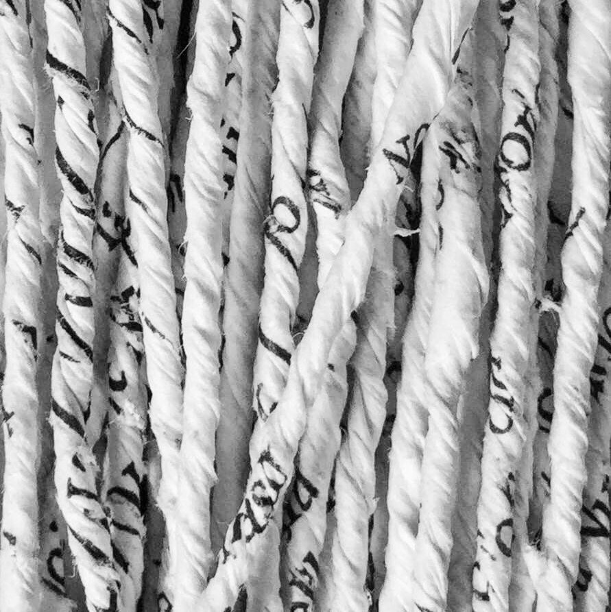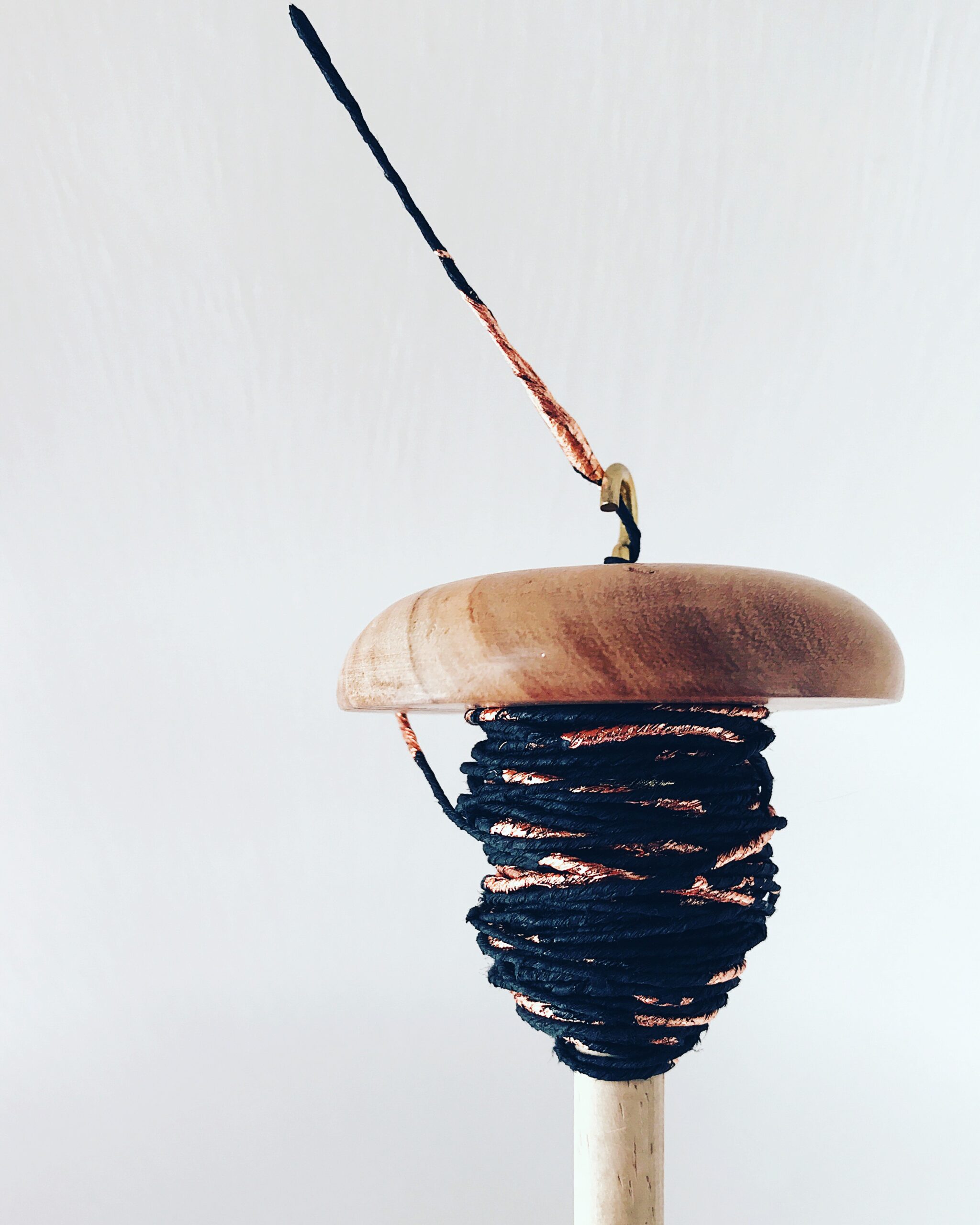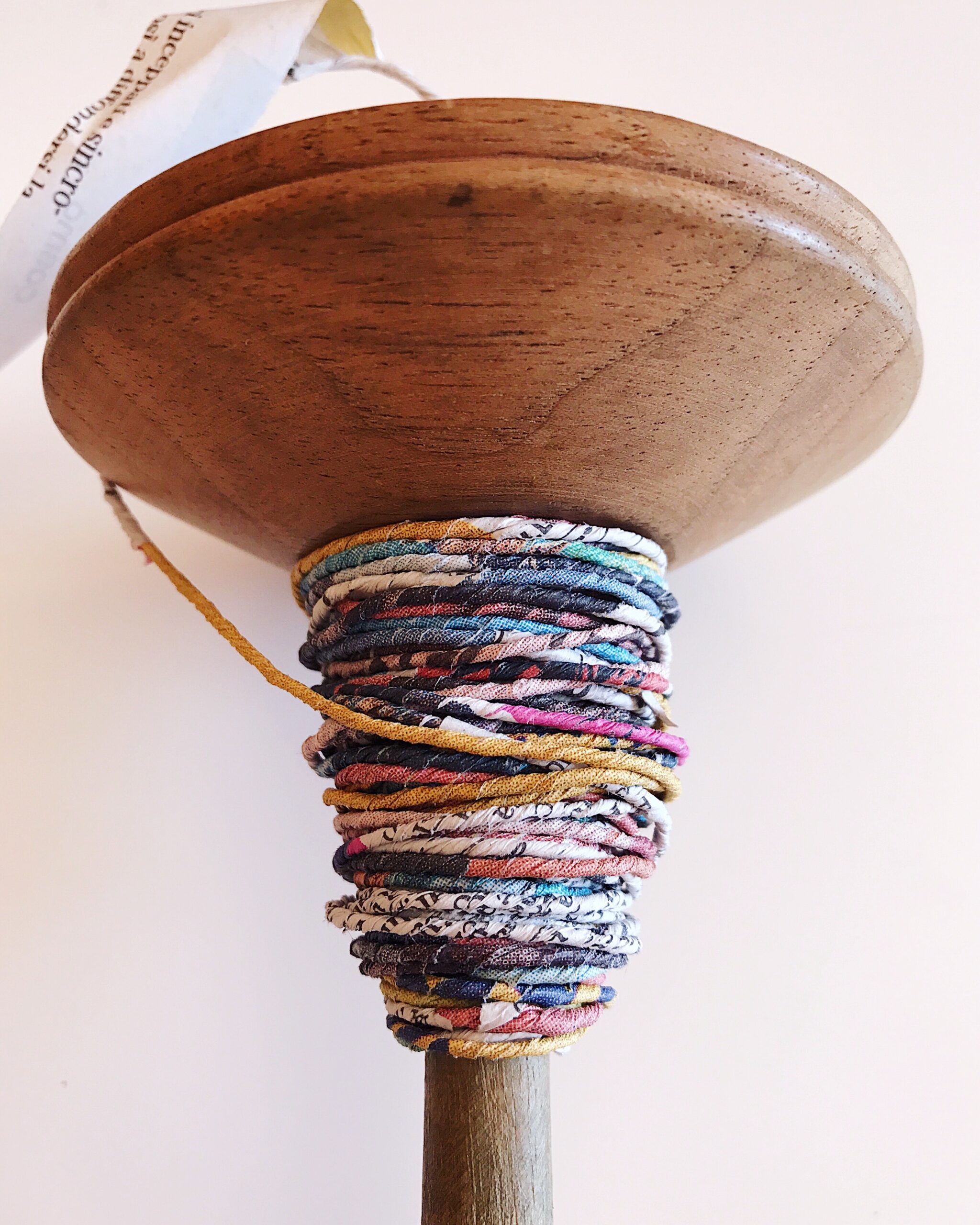 Si tratta di uno fuso recuperato dal mondo delle arti femminili utilizzato per trasformare la lana e altre fibre, sia animali che vegetali, in filato. La tecnica consiste nel tagliare a strisce sottili circa otto fogli di carta sovrapposti, principalmente da recupero. Incollando una a una le estremità di queste strisce si ottiene una specie di fettuccia che poi viene attorcigliata con le mani, agganciata al fuso e quindi filata.
