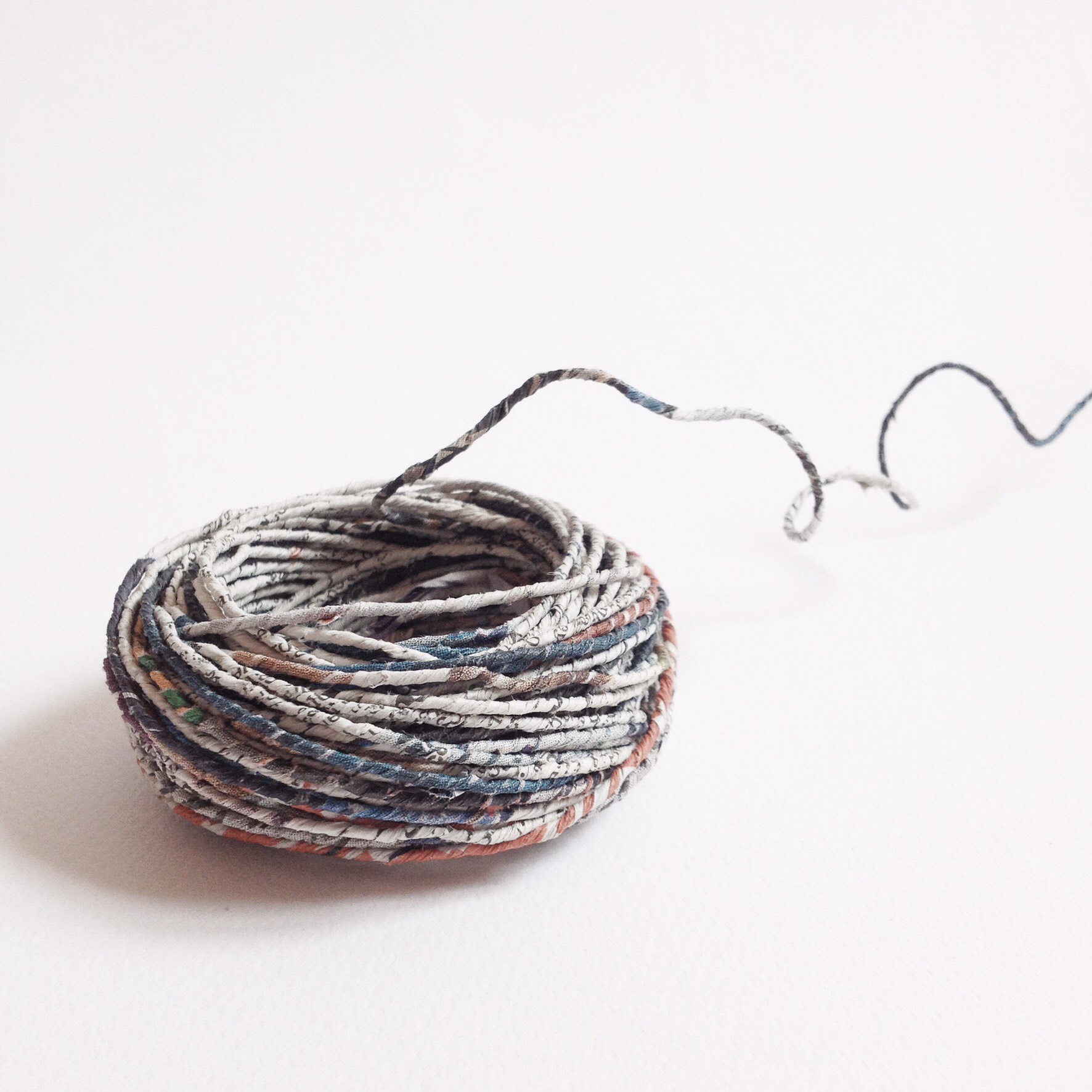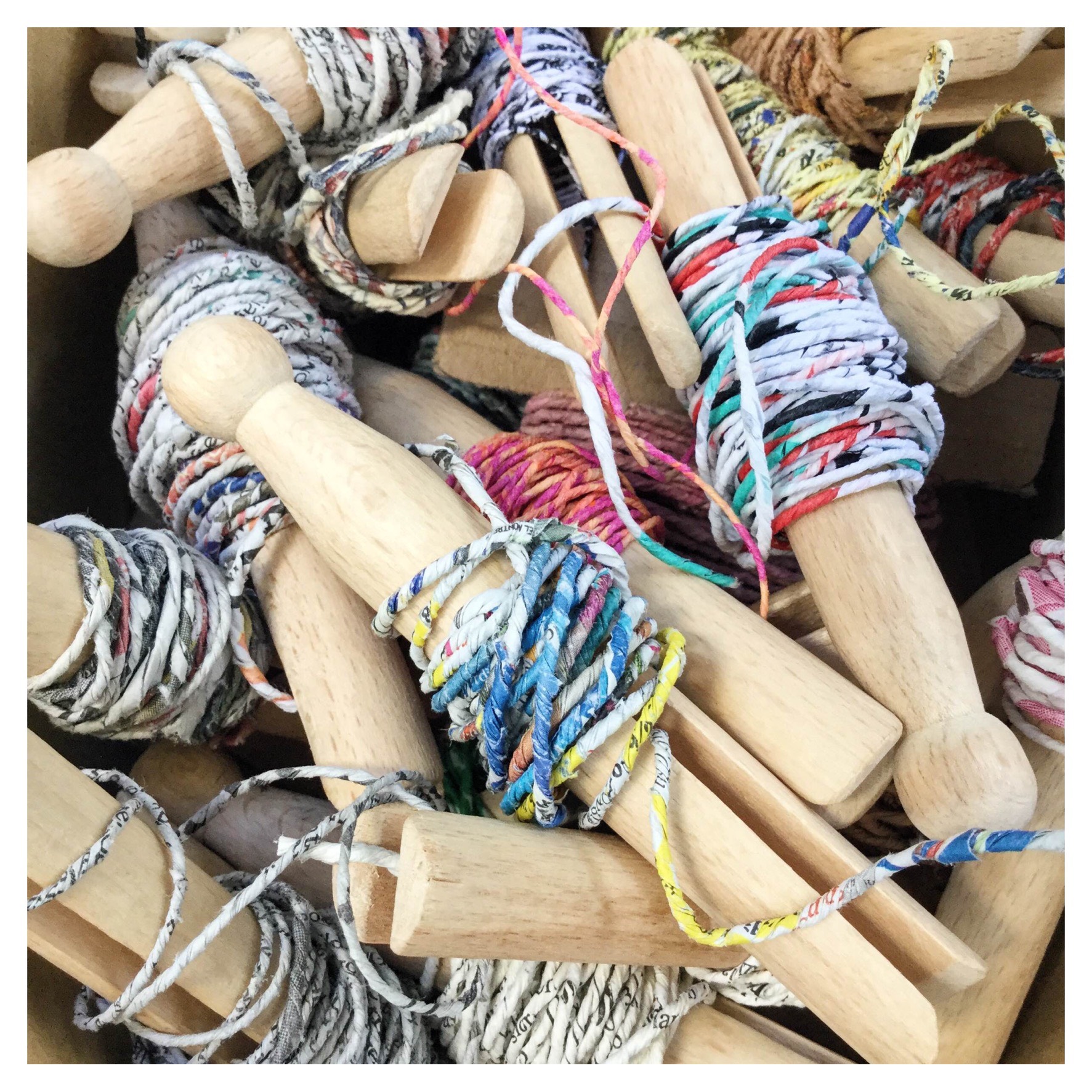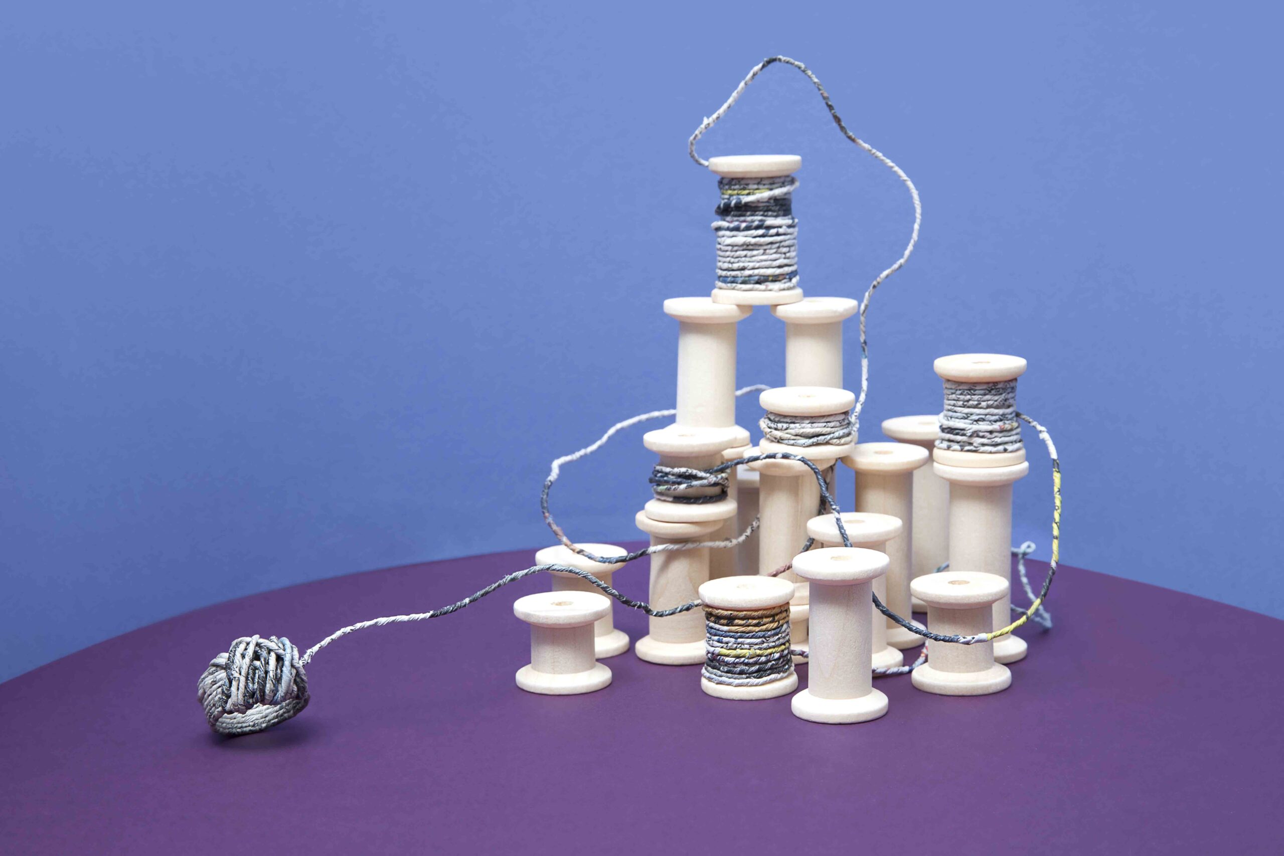 Si tratta di uno fuso recuperato dal mondo delle arti femminili utilizzato per trasformare la lana e altre fibre, sia animali che vegetali, in filato. La tecnica consiste nel tagliare a strisce sottili circa otto fogli di carta sovrapposti, principalmente da recupero. Incollando una a una le estremità di queste strisce si ottiene una specie di fettuccia che poi viene attorcigliata con le mani, agganciata al fuso e quindi filata.