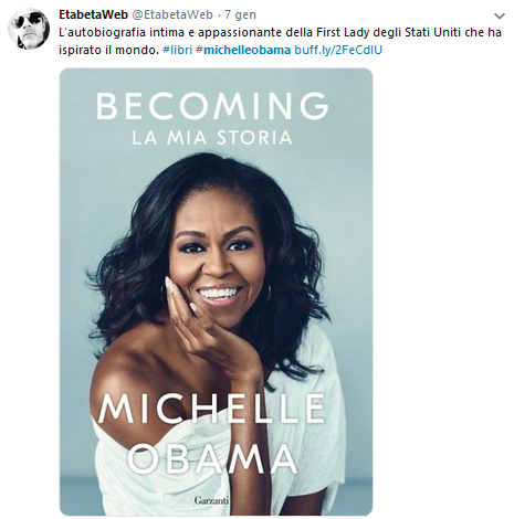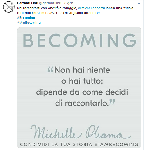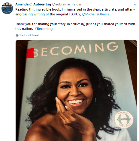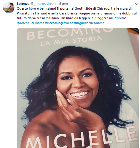 Sui social è rimbalzata anche una frase: Il segno dei tempi è che l’uomo più famoso al mondo è una donna, Michelle Obama. Ma perché tanto interesse per una figura che, in molti altri casi, è stata semplicemente di secondo piano? Innanzitutto non è secondario il ruolo dell’identificazione, come nel caso di Cenerentola o di Julia Roberts in Pretty Woman. Quella di Michelle è’ la storia di una donna comune, che affronta, come ognuna di noi, alti e bassi della vita e della carriera. Certo è anche la storia della prima first lady afro-americana a ricoprire questo ruolo. First lady che ha reso la Casa Bianca più accogliente e inclusiva, affermandosi di fatto come punto di riferimento per donne e ragazze non solo negli Stati Uniti, ma a livello internazionale. La biografia di Michelle è un percorso di riflessione che parte da se stessa, becoming me; dal suo rapporto con Barack e la creazione della sua famiglia, becoming us; fino all’esperienza della Casa Bianca e le sue ambizioni future, becoming more.