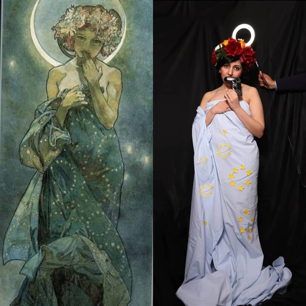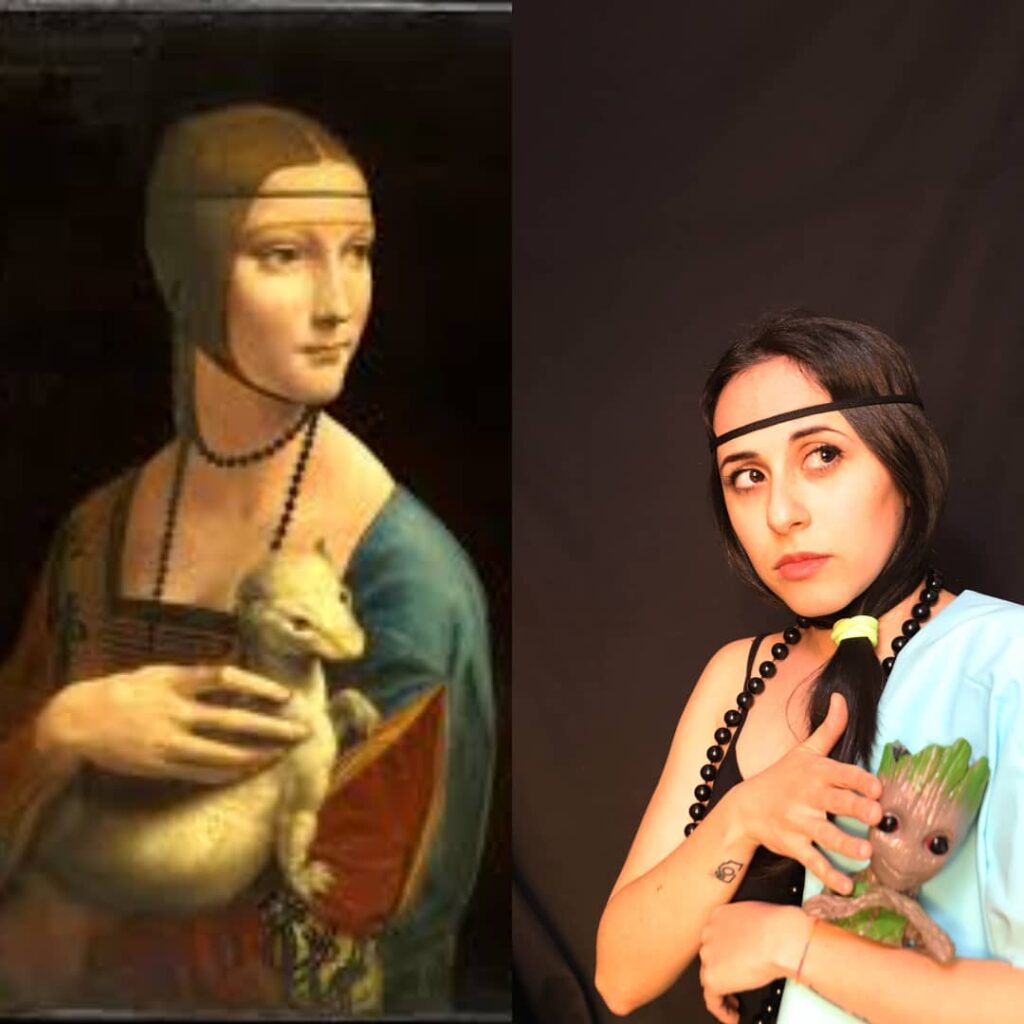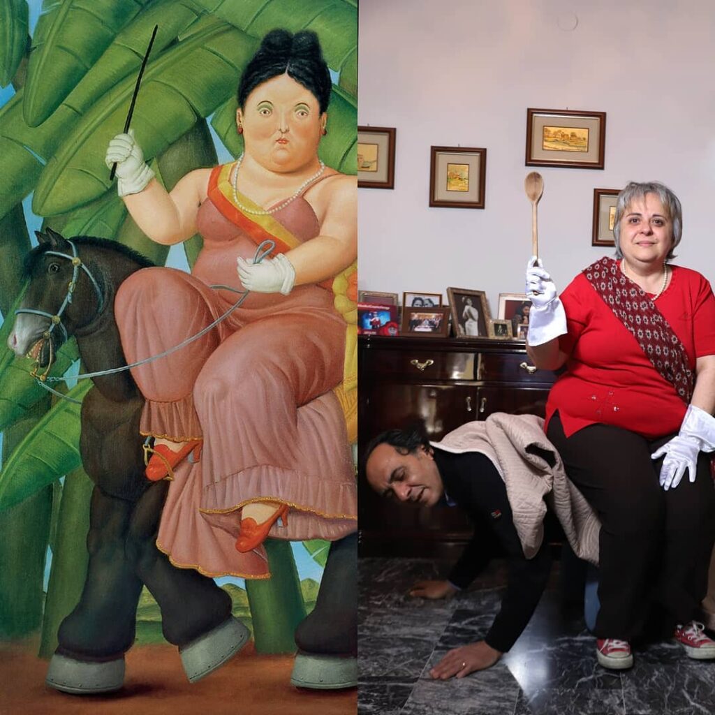 Fra le moltissime foto postate e ripostate dall’account del Getty Museum ci sono anche quelle di Giovanna Focarelli Barone, 23 anni, aspirante fotografa: “Ho scoperto questo challenge rilanciato dal Getty Museum grazie a mia sorella, laureata in Lettere e Beni Culturali. Visto il successo del challenge, ho voluto riproporlo ai miei amici poiché ogni settimana creo qualche sfida per divertirci insieme e occupare le giornate in quarantena. La mia idea era quella di partecipare insieme a tutti i componenti della mia famiglia per essere di ispirazione ad altre famiglie, dimostrando così che l’arte può essere anche divertente”.