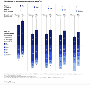 Il report mostra che il 45% degli uomini che iniziano la carriera in un’occupazione di fascia medio-bassa riesce ad accedere ai livelli salariali più alti entro dieci anni. Tra le donne, la percentuale scende al 30%. E questo divario emerge presto. Secondo McKinsey, è già durante la prima promozione o il primo cambio di ruolo che iniziano a farsi notare differenze significative. L’idea che le disuguaglianze si accumulino solo nel lungo periodo è falsa: spesso si manifestano già nelle fasi iniziali di carriera.