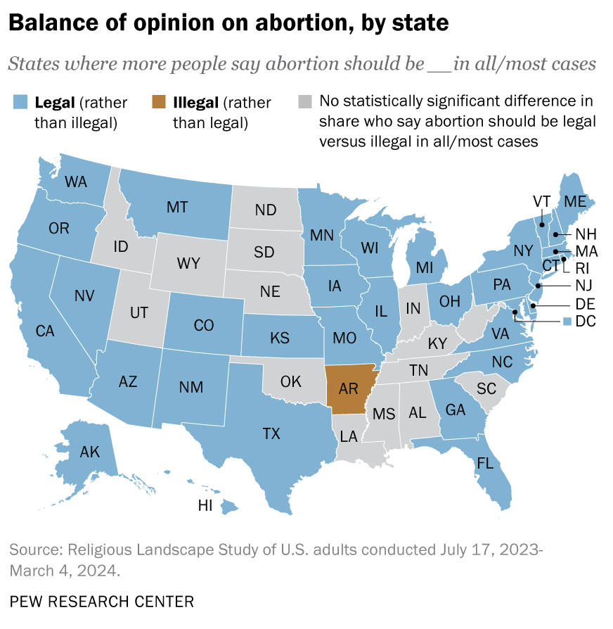 Di contro, l’unico stato in cui la posizione prevalente è contraria – dove, quindi, la maggior parte dei cittadini ritiene che la pratica debba essere illegale nella maggior parte dei casi – è l’Arkansas. Qui sono 57% quelli che hanno questo punto di vista.