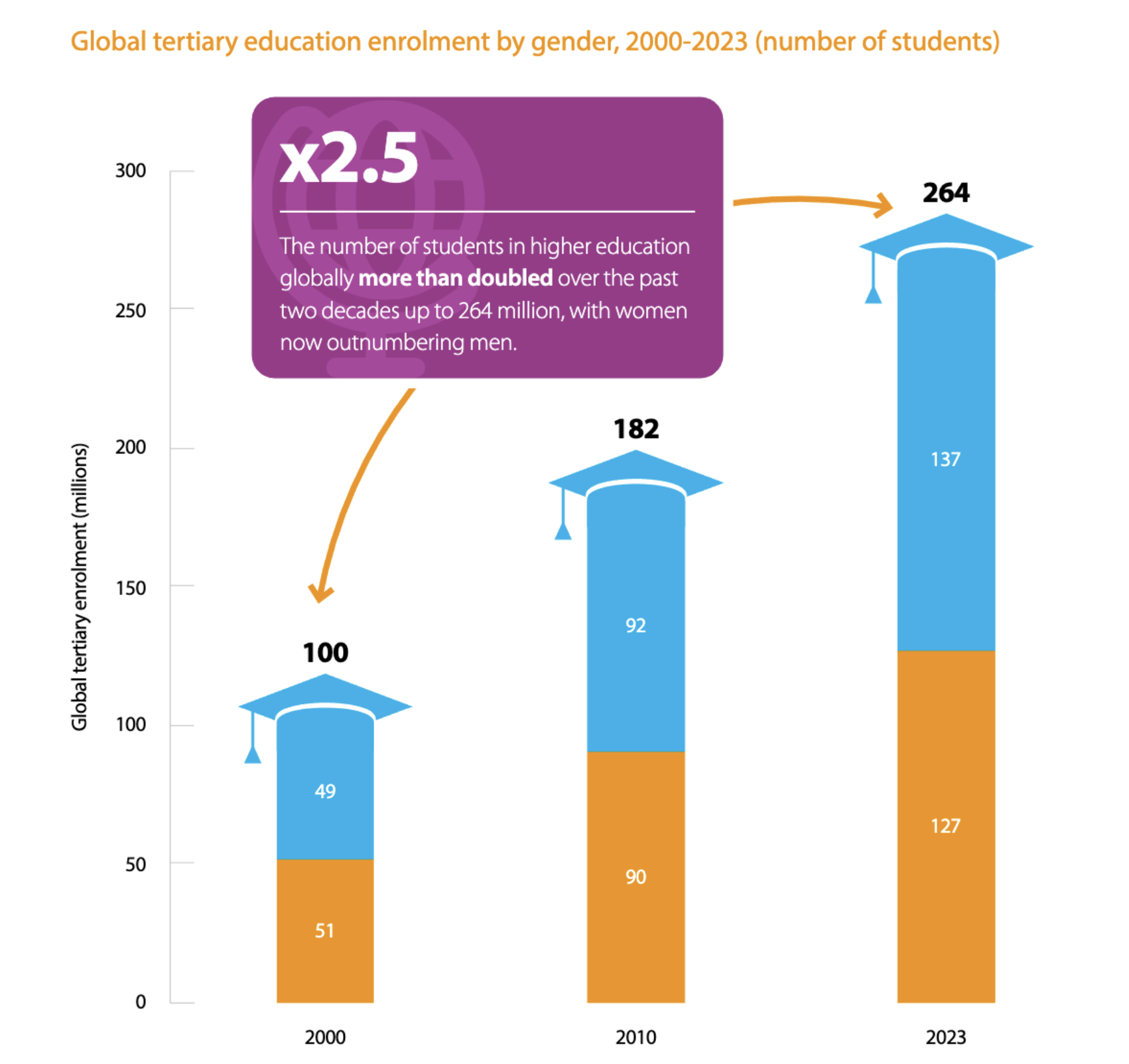 È record di iscritti a percorsi di studio superiore, quelli cioè a cui si accede dopo il diploma di scuola secondaria di secondo grado. Secondo gli ultimi dati Unesco, sono 264 milioni a livello mondiale quelli che seguono programmi di educazione terziaria. Un balzo in avanti pari a più del doppio del totale che era stato registrato a inizio secolo. E un incremento di 25 milioni solo rispetto alla quota del 2020.
