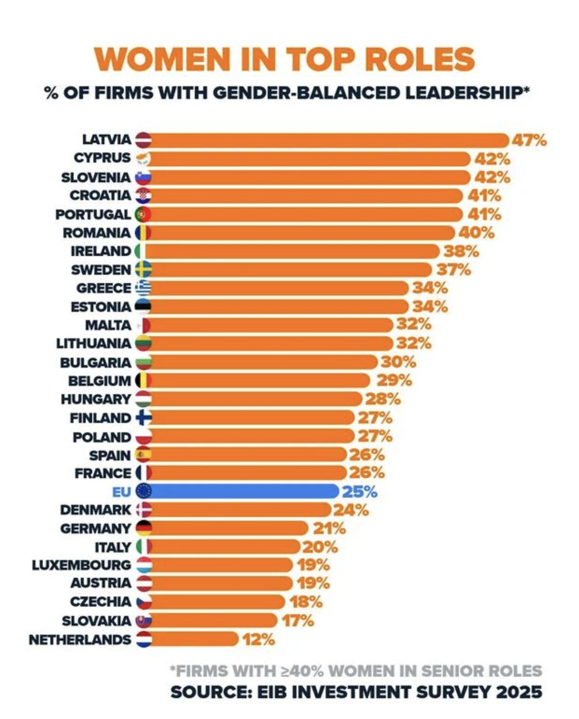 % di società dell’Ue con almeno il 40% di donne executive, EIB Investment Survey, 2025