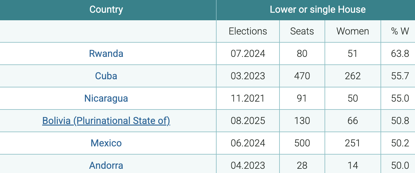 Ad oggi, poi, continuano le rilevazioni IPU, la parità di genere tra gli eletti si raggiunge in sette nazioni. Si tratta di Rwanda (63,8%), Cuba (55,7%), Nicaragua (55%), Bolivia (50,8%), Messico (50,2%), Andorra e Emirati arabi uniti (entrambi al 50%). Mentre, all’estremo opposto, nessun seggio è occupato da una donna in Oman, a Tuvalu e nello Yemen. E le elette sono meno del 5% in Iran, Bhutan, Nigeria, nelle Maldive, in Papua Nuova Guinea e Vanuatu.