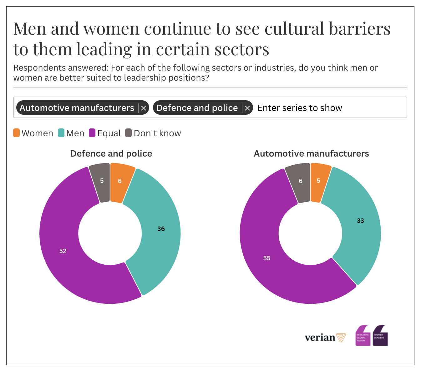 [2] Secondo il 36% dei rispondenti gli uomini sono leader più adatti nella difesa e il 33% nell’automotive. Le donne sono viste idonee alla guida di questi settori solo dal 6% e dal 5% rispettivamente.