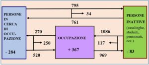 La situazione sopra illustrata, riferita al 2024, è notevolmente diversa da quella degli ultimi anni del secolo scorso[1], quando il verso dei flussi netti rappresentava il tradizionale percorso di persone che al termine del periodo scolastico uscivano dall’inattività e si mettevano alla ricerca di occupazione, trovavano lavoro e, a fine carriera, rientravano tra le persone inattive come pensionati.