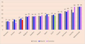 Il confronto con gli altri Paesi (Figura 2) conferma che in Italia è sotto la media europea la probabilità di una persona disoccupata di trovare lavoro: 27% contro 37%. Se si considera in particolare la componente femminile, solo una disoccupata su quattro, in Italia, trova lavoro in corso d’anno, contro una disoccupata su tre in media europea e una su due in Germania.