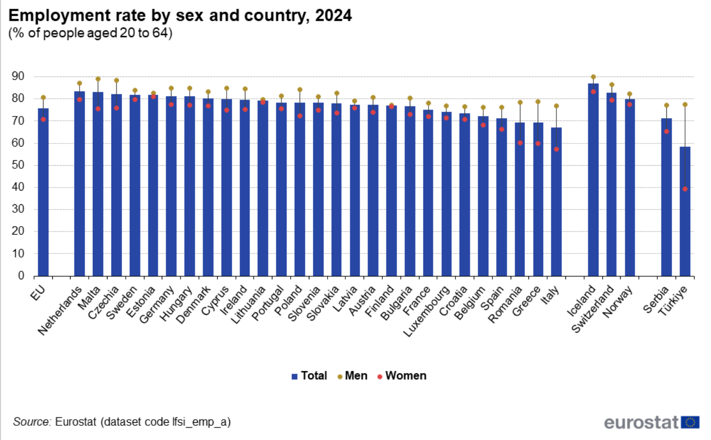 A prescindere dal genere, è interessante ricordare che in tutta l’Unione solo sei Paesi registrano tassi di occupazione superiori al target del 78% fissato per il 2030. Si tratta di: Paesi Bassi (83,5%), Malta (83%), Repubblica Ceca (82,3%), Svezia (81,9%), Estonia (81,8%), Germania (81,3%) e Ungheria (81,1%).