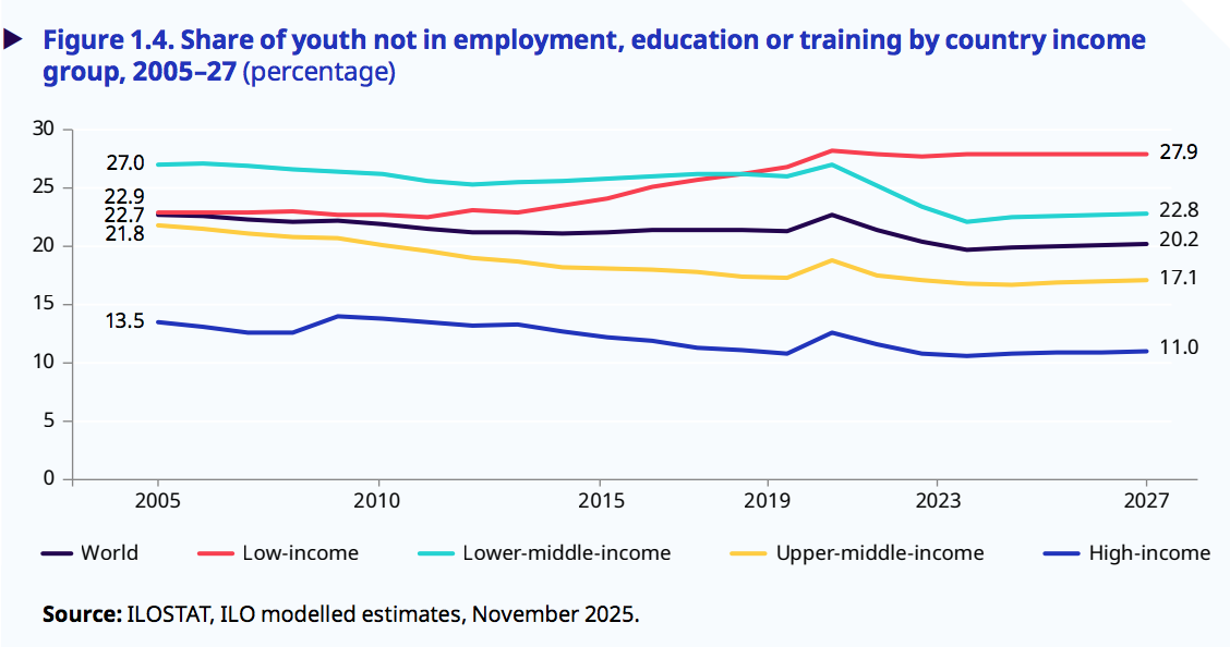 Nello stesso periodo, poi, è aumentata tra i ragazzi la percentuale dei neet (not in employment, education or traninig), arrivata a toccare il 20%. Ciò significa che 257 milioni di giovani oggi stanno perdendo opportunità di formarsi o acquisire competenze aggiornate che possano permettergli migliori prospettive lavorative future. Questa situazione diffusa, appare specialmente difficile nei Paesi più poveri. Qui infatti la percentuale di quelli che non hanno un lavoro, non lo cercano e non stanno seguendo percorsi di formazione è addirittura di 17 punti percentuali superiore a quella registrata tra gli stati ad alto reddito.