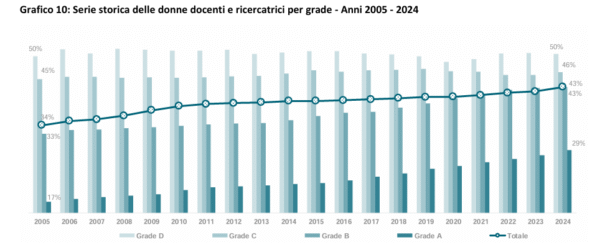 Nel 2015 le donne erano circa la metà tra i titolari di assegni di ricerca e tra i ricercatori universitari, similmente a oggi, mentre erano al 36% tra i professori associati e al 22% tra i professori ordinari.